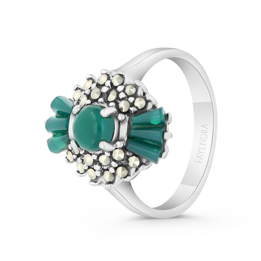 سواء كنت تحضرين لمناسبة خاصة أو تتطلعين إلى إضافة لمسة من الرقي إلى اطلالتك اليومية ، سيكون هذه الخاتم الكلاسيكي من الفضة الإسترلينية عيار 925 هو الخيار الأمثل خصوصا اذا ما أقرن بأقراط مماثلة ،الخاتم الرائع جمع بين الأناقة وجمال الطبيعة. وقد صمم بدقة ، ليعكس سحر العقيق الأخضر والجاذبية الآسرة لأحجار الماركاسيت.