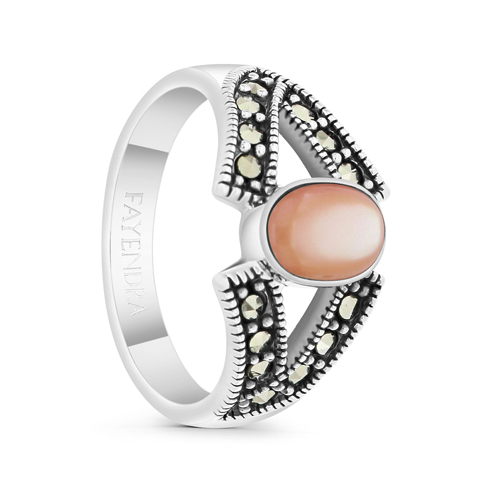 خاتم من الفضة الخالصة عيار 925 مرصع احجار صدف وردي طبيعي و ماركسايت