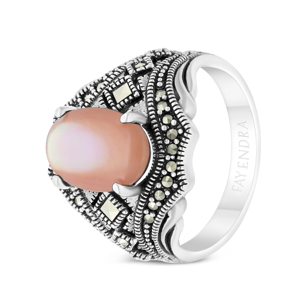خاتم من الفضة الخالصة عيار 925 مرصع احجار صدف وردي طبيعي و ماركسايت