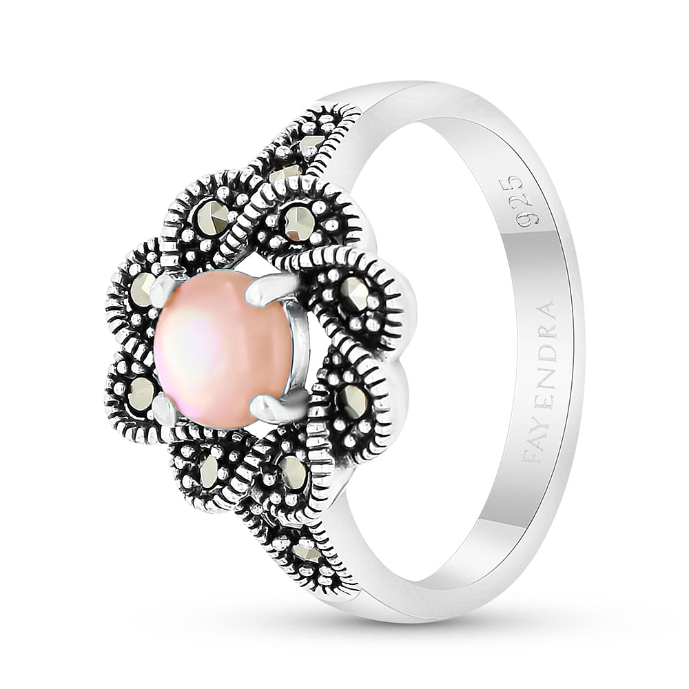 كل بتلة منها مصاغة بدقة من الفضة الإسترلينية عالية الجودة ومرصعة بأحجار الماركاسيت مما يوفر بريقًا دائمًا يأسر الناظرين ويرصع الوسط حجر صدف وردي طبيعي بمظهر راق وجميل.