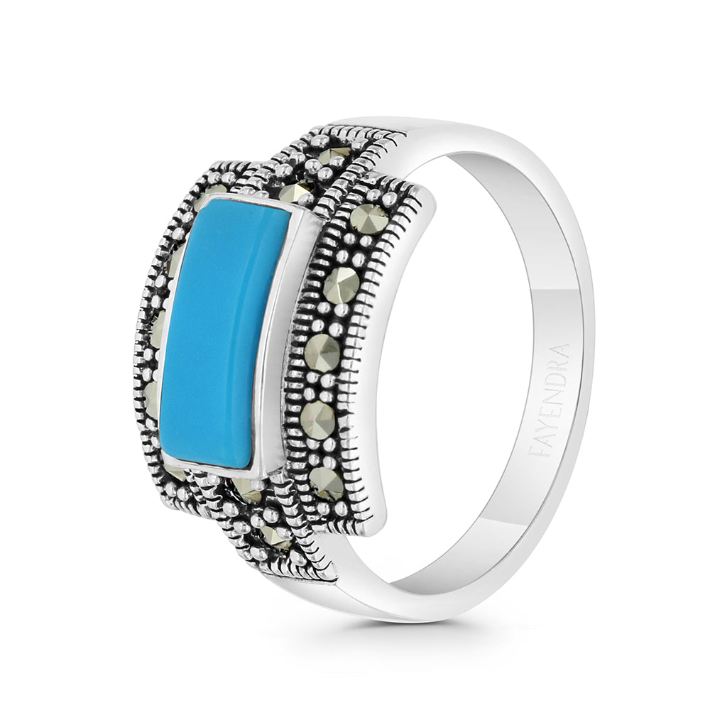 خاتم فضة كلاسيكي مرصع بأحجار الماركاسيت الصافية ذات اللمعان الرائع، يتوسطه حجر فيروز طبيعي معالج بقصة مستطيلة. .