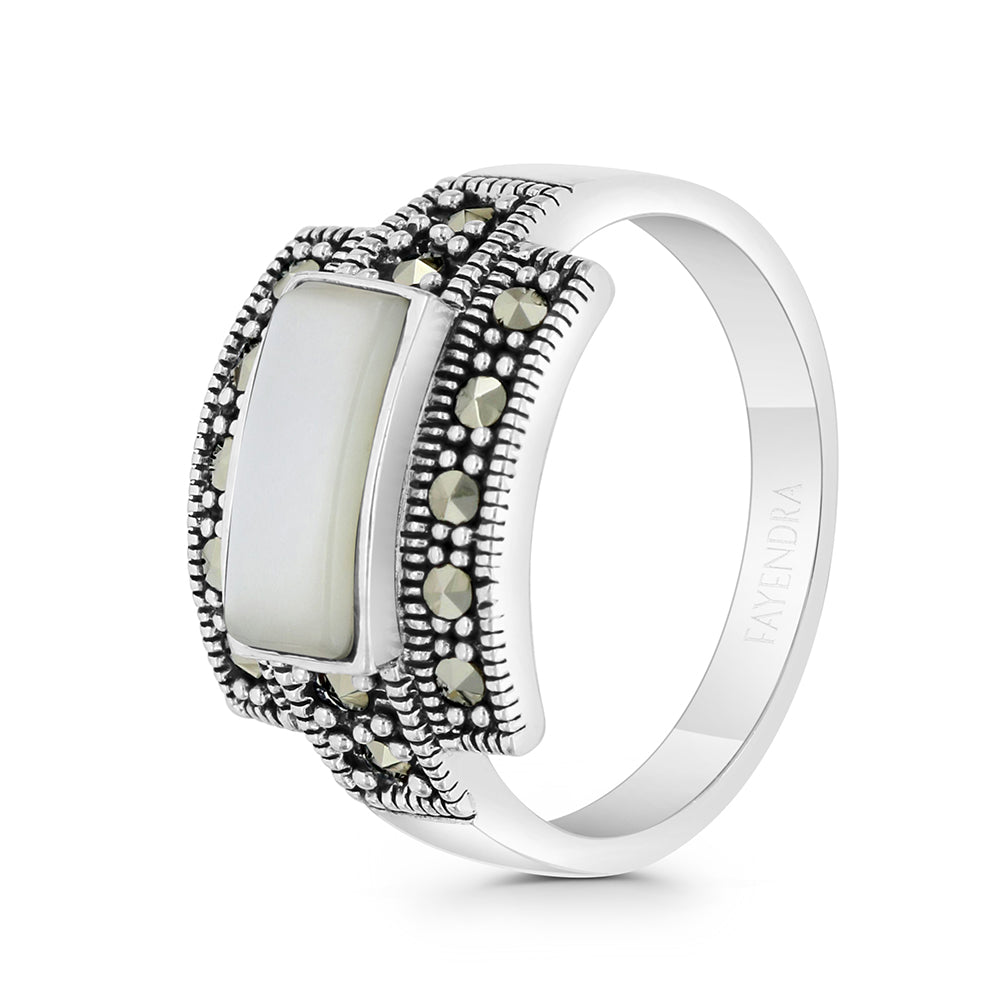 خاتم فضة كلاسيكي مرصع بأحجار الماركاسيت الصافية ذات اللمعان الرائع، يتوسطه حجر أم اللآلئ طبيعي معالج بقصة مستطيلة..