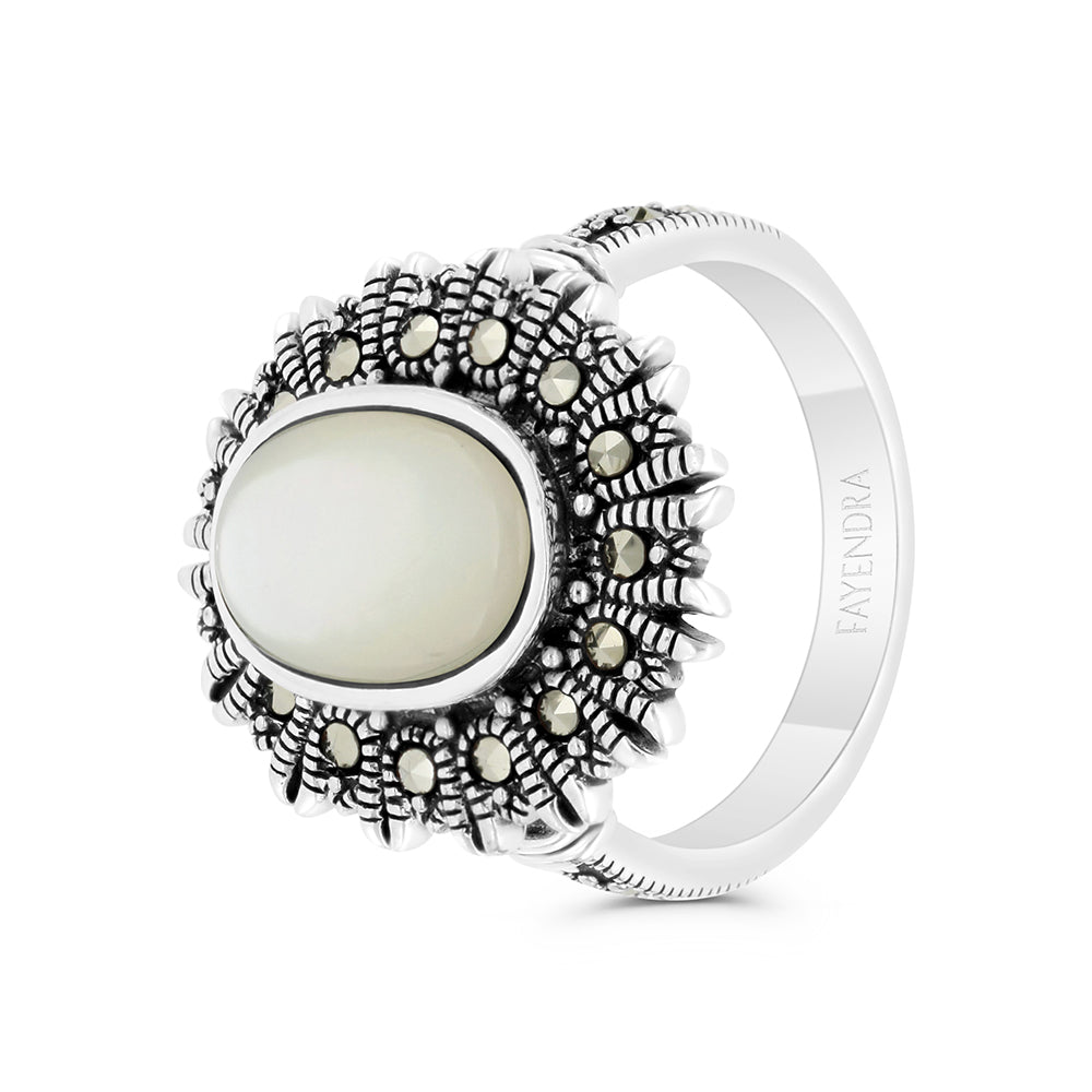 خاتم من الفضة الخالصة عيار 925 مرصع احجار صدف ابيض طبيعي و ماركسايت