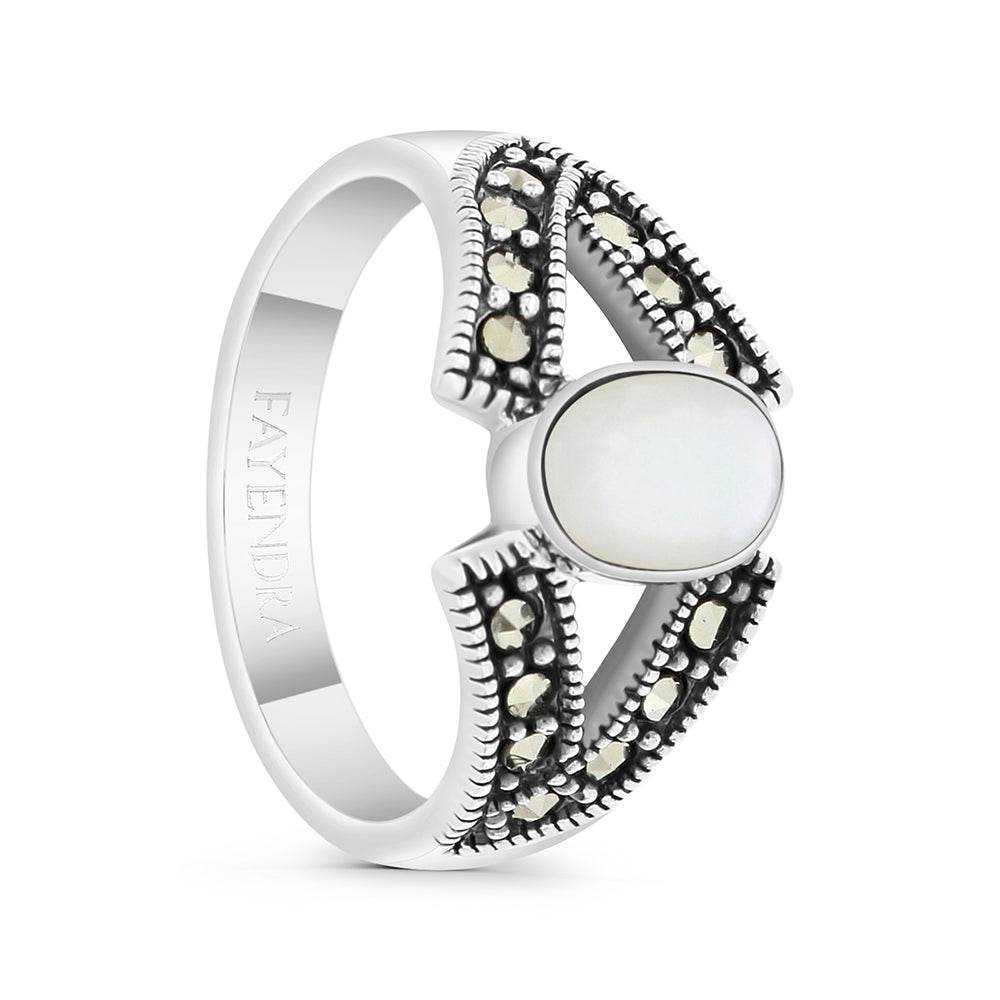 خاتم من الفضة الخالصة عيار 925 مرصع احجار صدف ابيض طبيعي و ماركسايت