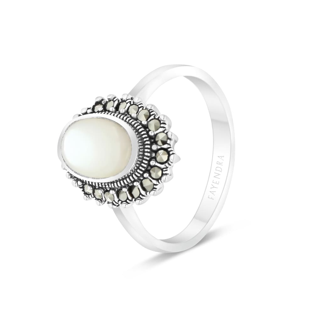 خاتم من الفضة الخالصة عيار 925 مرصع احجار صدف ابيض طبيعي و ماركسايت