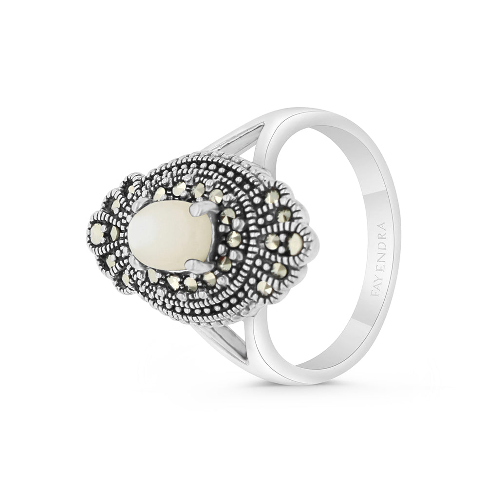 خاتم من الفضة الخالصة عيار 925 مرصع احجار صدف ابيض طبيعي و ماركسايت