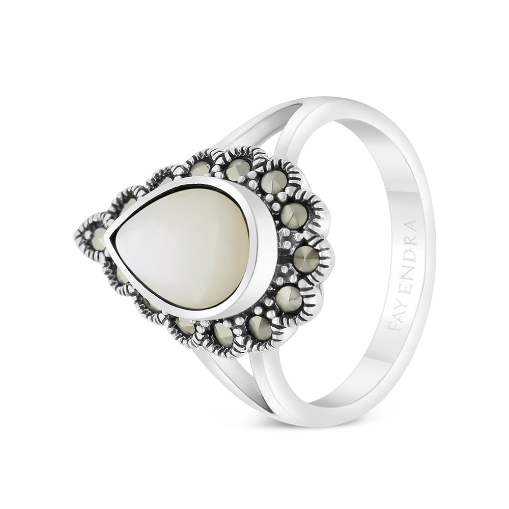 خاتم فاخر من الفضة الإسترليني عيار 925 ، من مجموعة فايندرا الكلاسيكية ، مزين بقطعة مركزية من حجر الصدف الأبيض الطبيعي في قصة الدمعة،