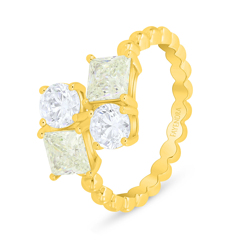 يتزيّن التصميم بتوليفةٍ مذهلةٍ من أربعة أحجار زركون متلألئة تجمع بين الزركون الأبيض المشع بتقطيع بريليانت والزركون الكناري بتقطيع برنسيس، في انسجامٍ أنيقٍ يعكس توازنًا رائعًا بين صفاء الضوء ودفء اللون الذهبي.