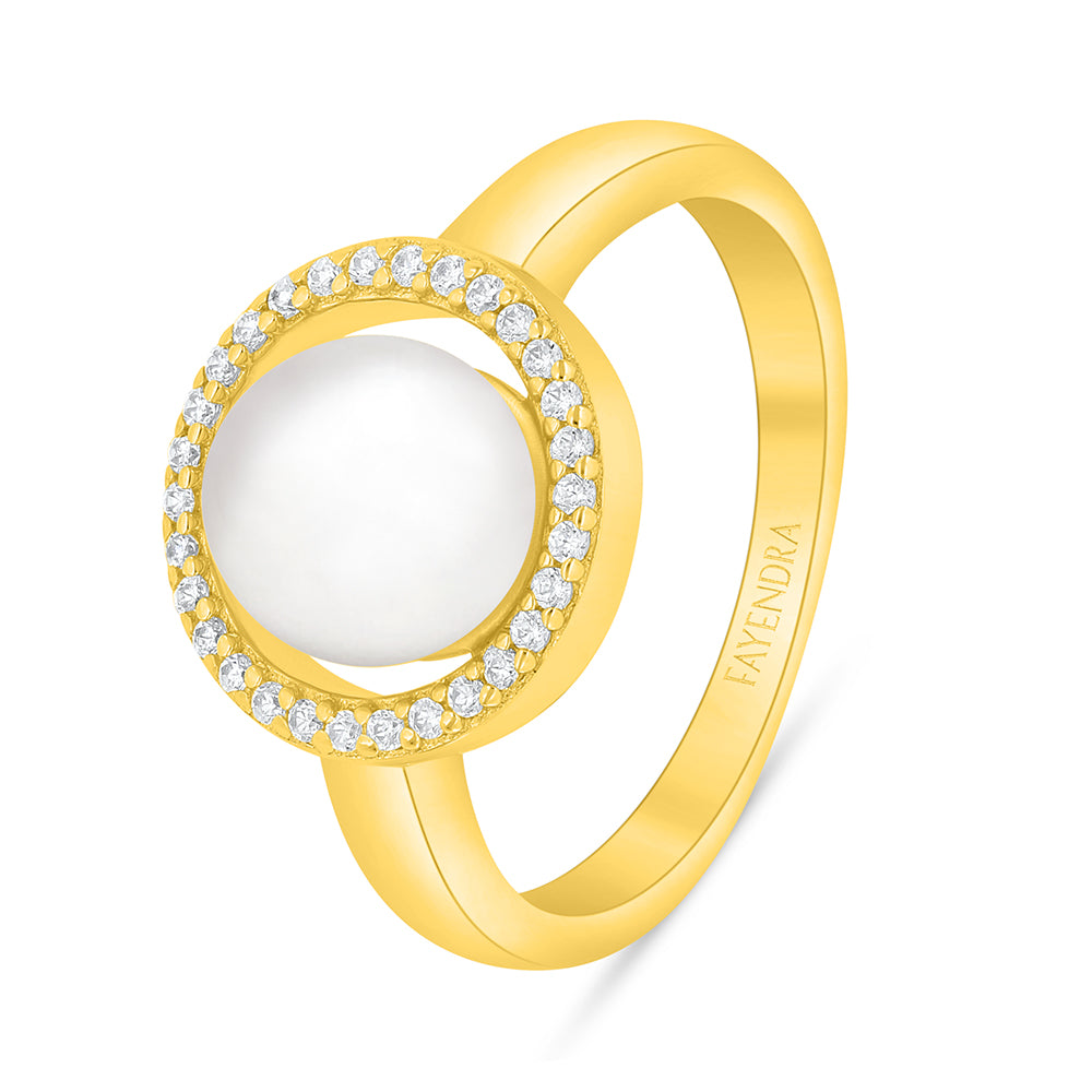 دللي أناملك مع هذا الخاتم المميز من فايندرا، المصنوع من الفضة الإسترلينية عيار 925 ومطلي بطبقة من اللون الذهبي البهيج، بتصميم على شكل حلقة مفرغة مرصوفة بالكامل بأحجار زركون بيضاء مقطوعة بقصّة بريليانت ناعمة، تتوسطها لؤلؤة طبيعية بديعة. مما يضفي لمسة فاخرة تزيد من رونق إطلالتك. أضيفيه إلى سلتك الآن!