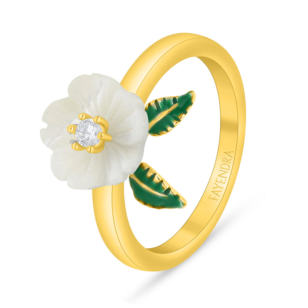 Total Weight: 2.9g استمتعي بسحر الطبيعة وأناقتها مع هذا الخاتم الفريد من فايندرا، المصنوع من الفضة الخالصة عيار 925 والمطلي بالذهب لبريق يدوم. يتألق الخاتم بتصميم زهرة منحوتة بدقة من الصدف الأبيض الطبيعي، تنبض بنعومة ورقة لا مثيل لهما، وفي مركزها يتلألأ حجر زركون أبيض فاخر بقصّة بريليانت يبعثر الضوء بلمعان آسر. يكتمل التصميم بأوراق انيميل خضراء مصممة بإتقان تمنحه لمسة حيوية تضيف بعدًا فنيًا وجاذبية استثنائية. قطعة تحتفي بالأنوثة والتفرّد، احصلي عليها الآن!