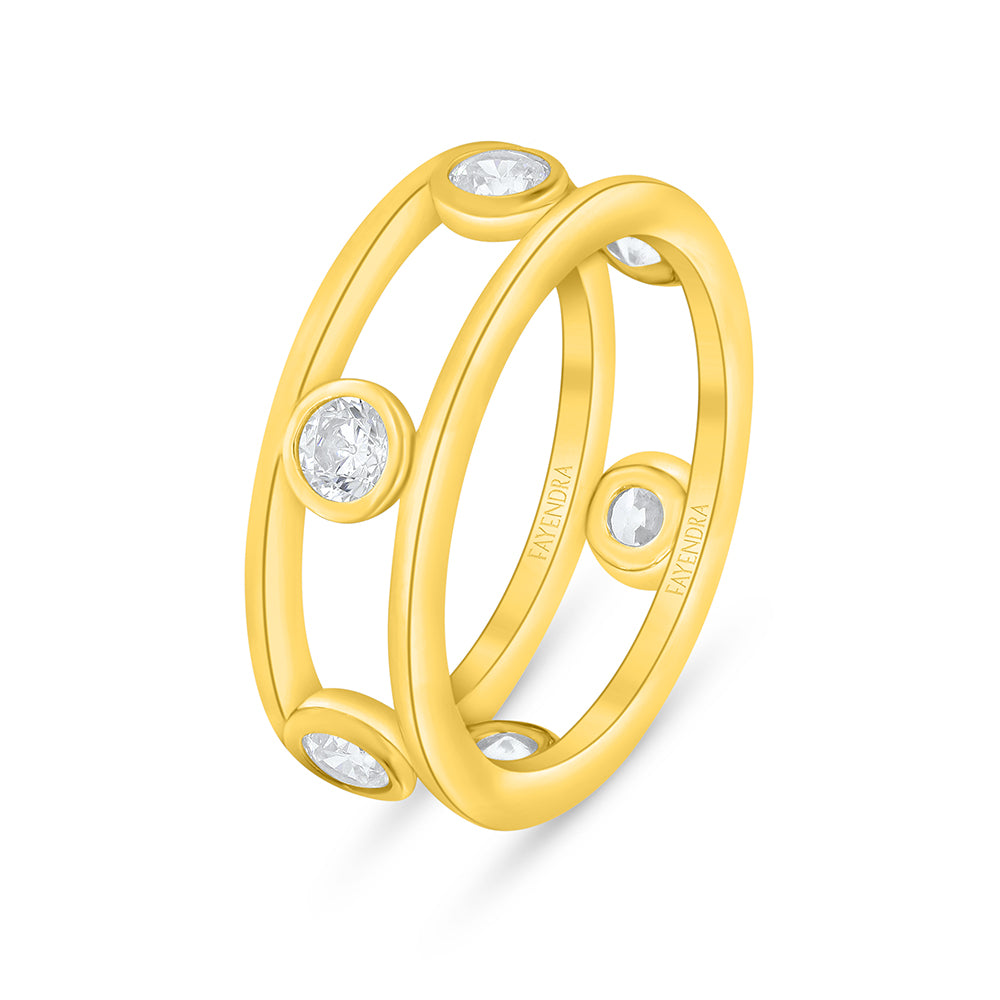 Total Weight: 4g دعي أناقتك تتحدث عنك بخاتم من الفضة الخالصة عيار 925، مطلي بطبقة من اللون الذهبي الفاخر. يتميز بتصميم عصري يجمع بين حلقتين متوازيتين تتصلان بأطر دائرية أنيقة، تحمل في داخلها أحجار زركون بيضاء بقصة بريليانت مميزة، لتمنحك لمسة من الفخامة والتفرد الذي لا يُضاهى. أضيفيه إلى سلتك الآن!