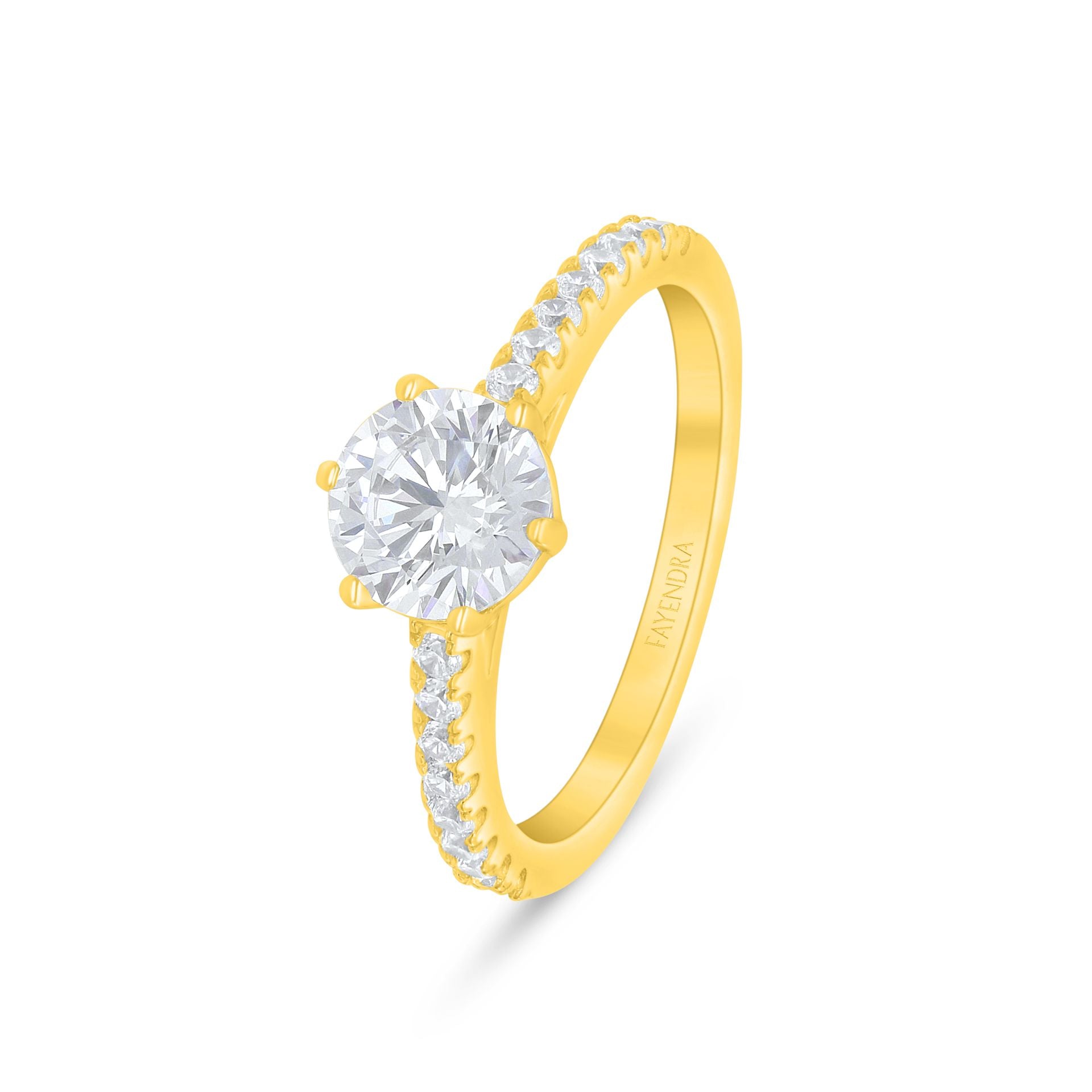 Total Weight: 2.8g خلّدي أهم لحظات عمرك مع خاتم سوليتير فايندرا الراقي، المصنوع من الفضة الخالصة عيار 925 والمطلي بالذهبي ليزيد من ا، والمرصّع بزركون أبيض مضيء كضوء القمر الساطع بقصة بريليانت الماسية انيقة، تحيط به نخبة من أحجار الزركون الأبيض المضيء كضوء القمر، ليعكس الضوء مع كل حركة من أناملك الساحرة.
