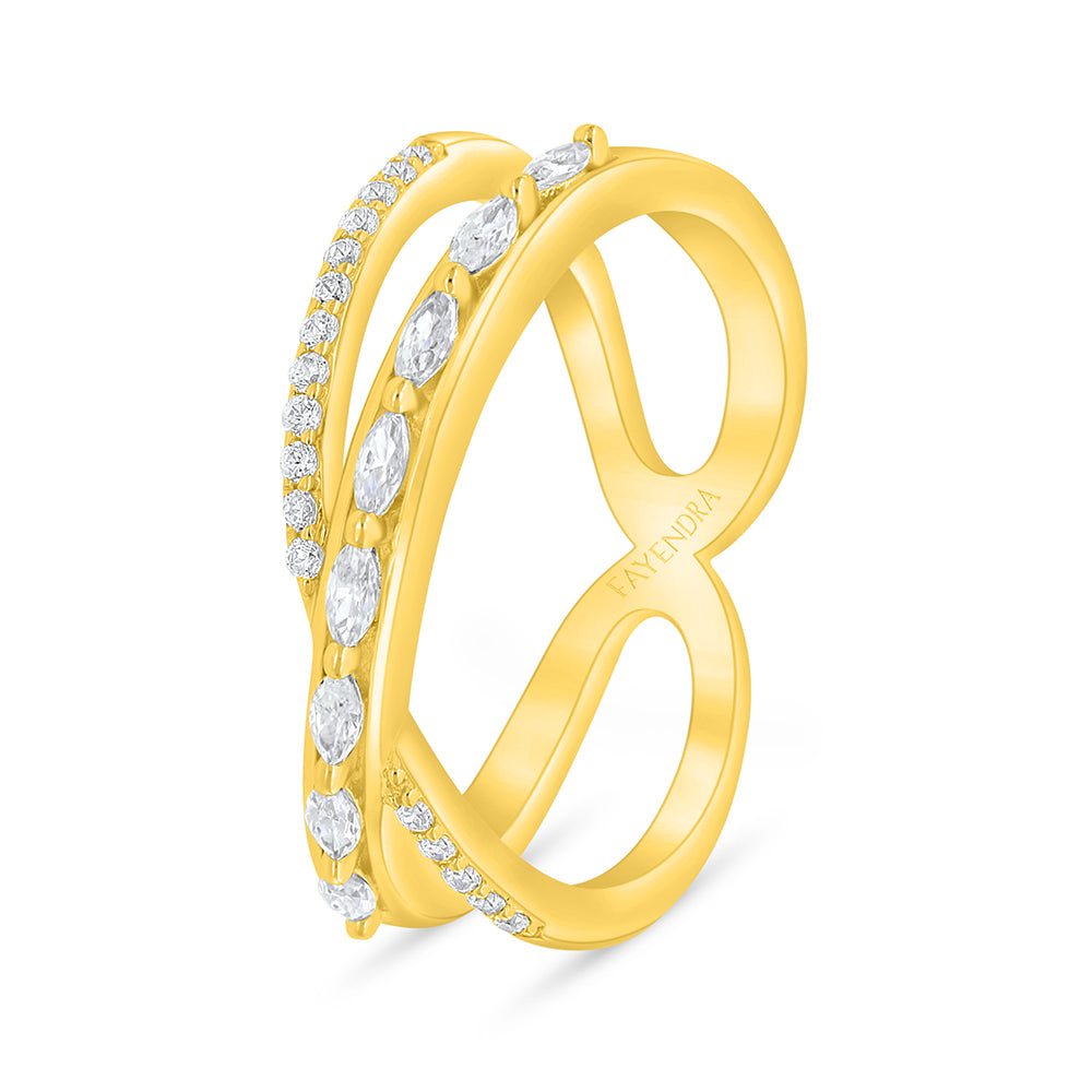 Total Weight: 2.9g خاتم من فايندرا مصنوع من الفضّة الخالصة عيار 925 والمطلي بالذهب ليحافظ على بريقه الفاخر! تصميم مبتكر بأذرع متقاطعة تضفي حركة انسيابية راقية، تتلألأ أحجار الماركيز الرفيعة بجاذبية مهيبة، وتتناغم مع بريق ولمعان الأحجار المستديرة الكلاسيكية، اجعليها اختياركِ اليوم وتألقي بإطلالة استثنائية!