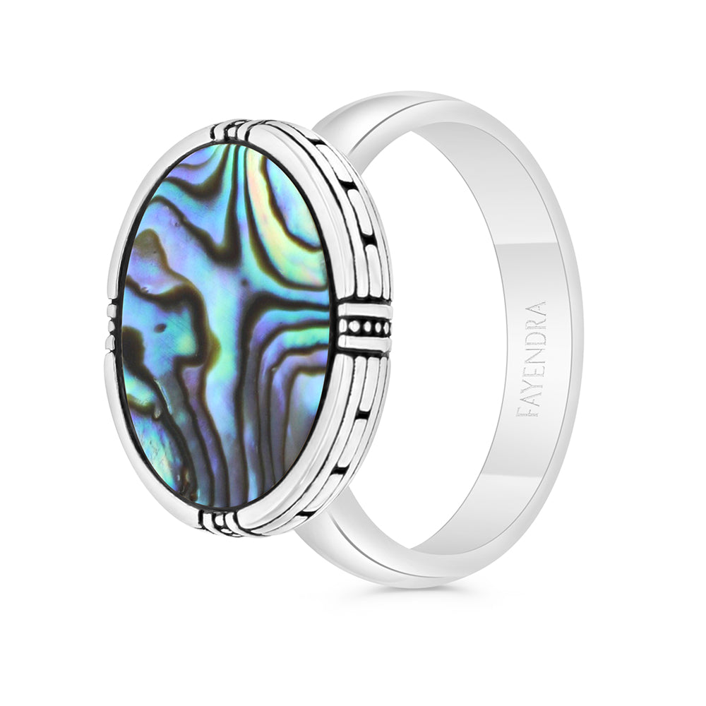 خاتم فضة أسترليني عيار 925 للرجال مرصع بحجر الصدف الأسترالي الطبيعي ويزين معدنه طلاء أسود فاخر،