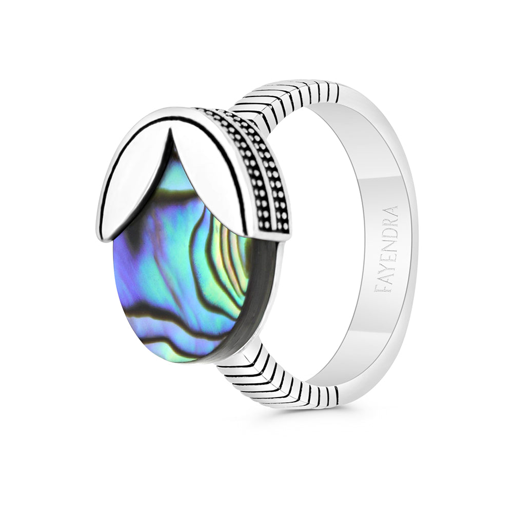 خاتم رجالي فضة عيار 925 مطلي روديوم و اسود مرصع احجار صدف استرالي ملكي