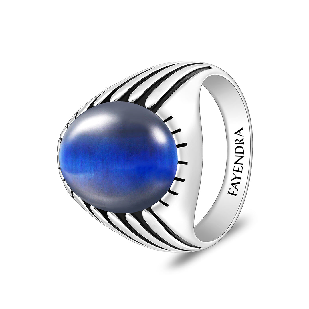 خاتم رجالي من الفضة الخالصة عيار 925 مطلي روديوم و اسود مرصع عين النمر ازرق كابشون