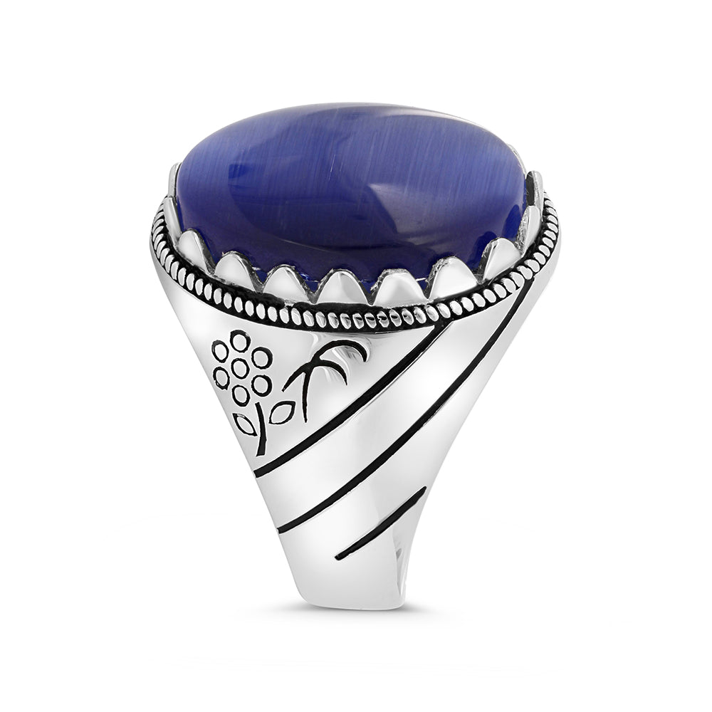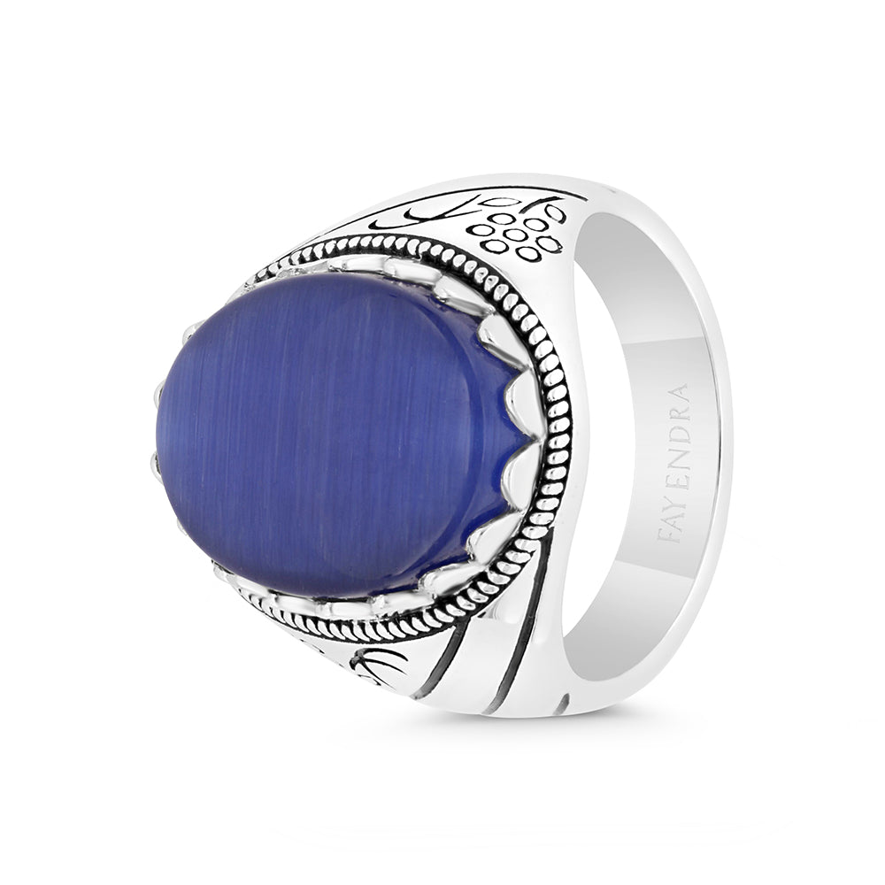 خاتم رجالي من الفضة الخالصة عيار 925 مطلي روديوم و اسود مرصع احجار عين النمر ازرق