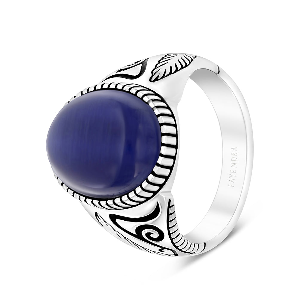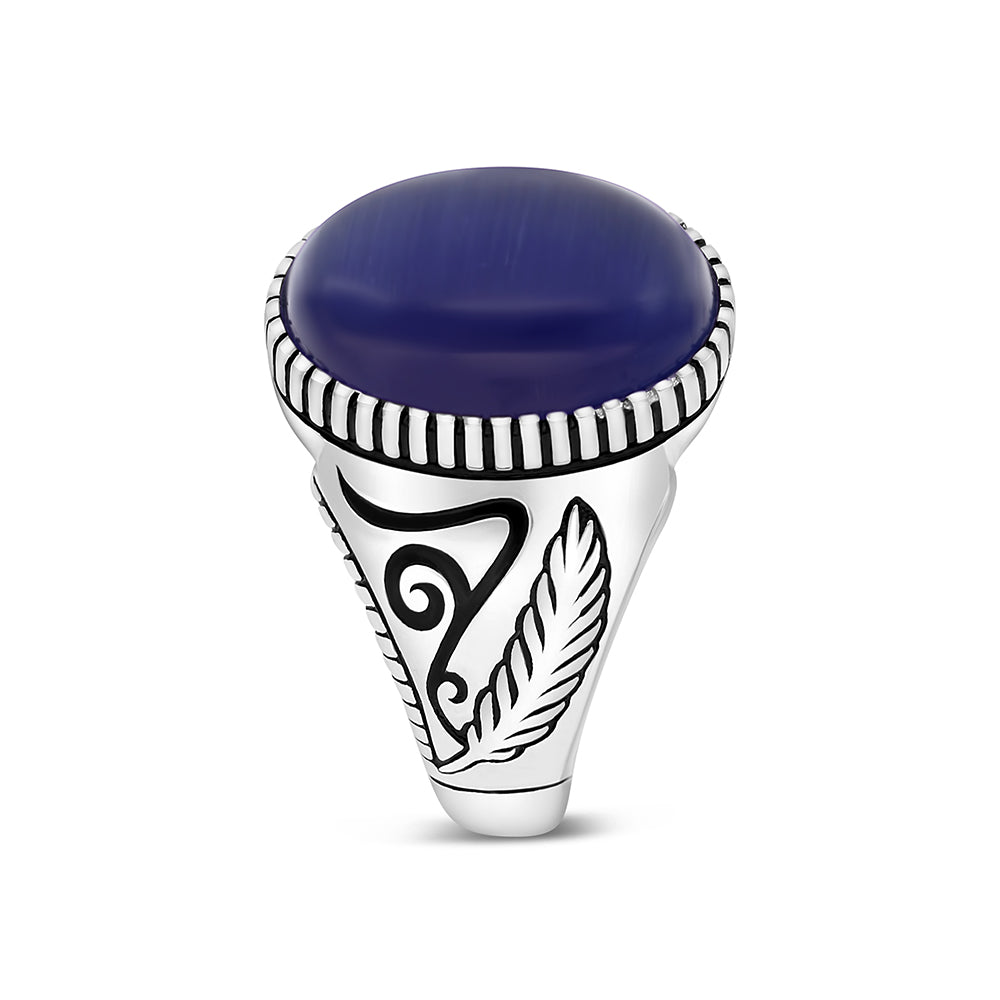 خاتم رجالي فضة عيار 925 مطلي روديوم و اسود مرصع احجار عين النمر ازرق