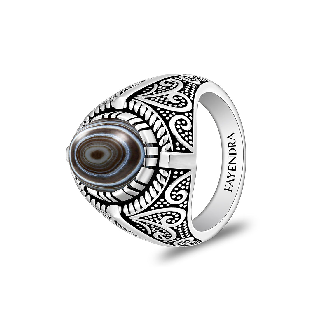 خاتم رجالي من الفضة الخالصة عيار 925 مطلي روديوم و اسود مرصع احجار عقيق سليماني كابشون