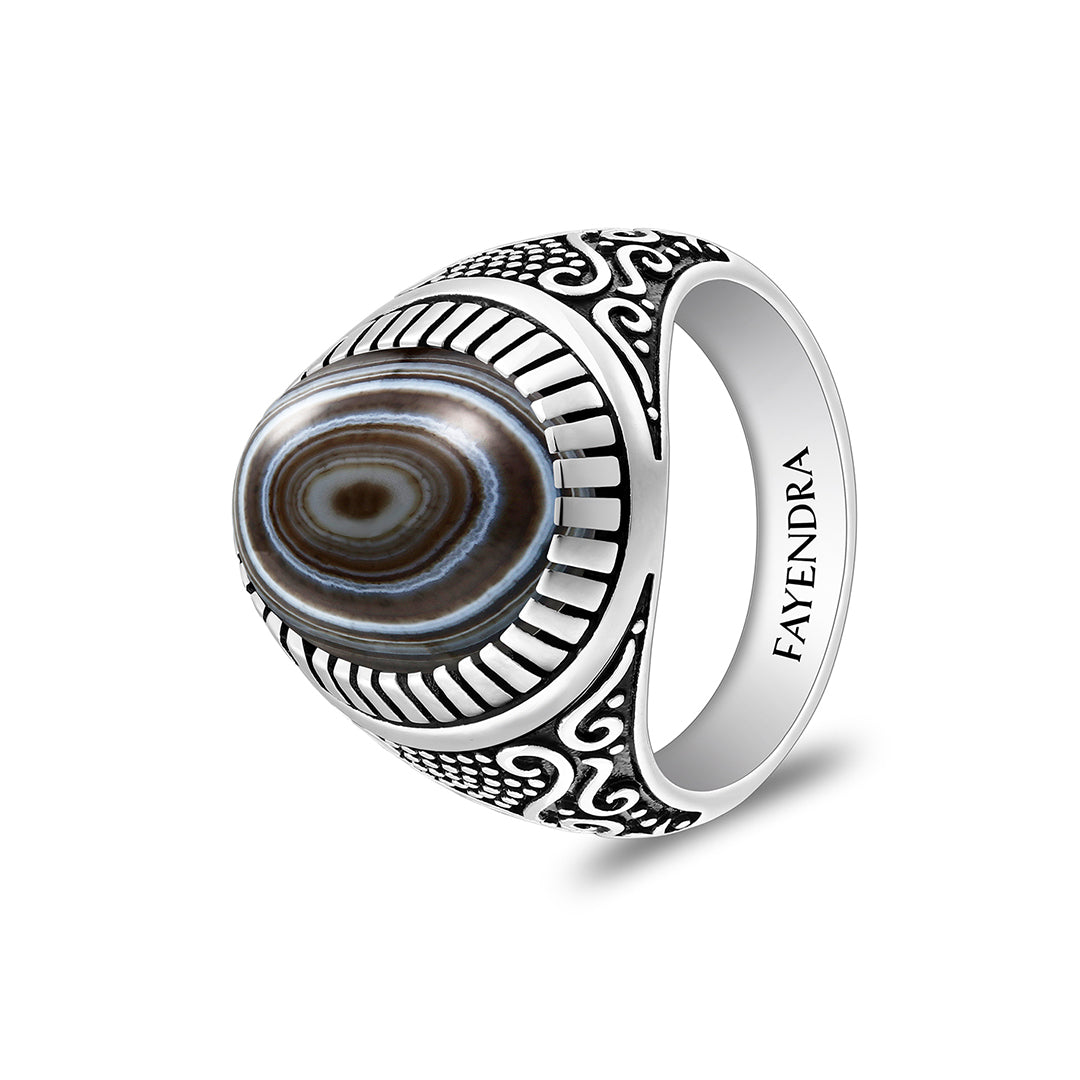خاتم رجالي من الفضة الخالصة عيار 925 مطلي روديوم و اسود مرصع احجار عقيق سليماني كابشون