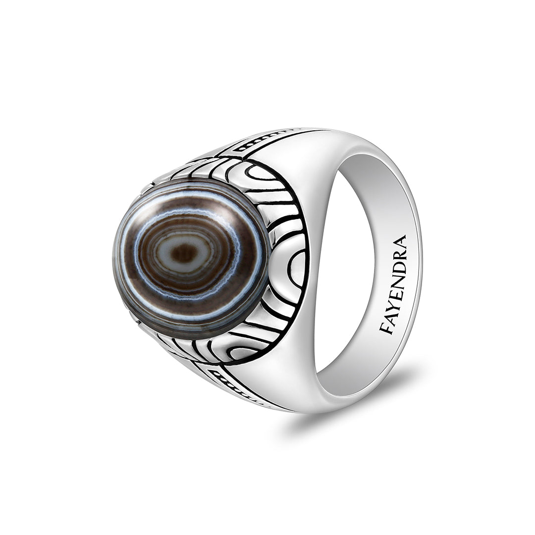 خاتم رجالي من الفضة الخالصة عيار 925 مطلي روديوم و اسود مرصع احجار عقيق سليماني كابشون