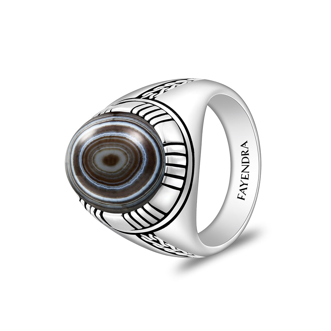 خاتم رجالي من الفضة الخالصة عيار 925 مطلي روديوم و اسود مرصع احجار عقيق سليماني كابشون