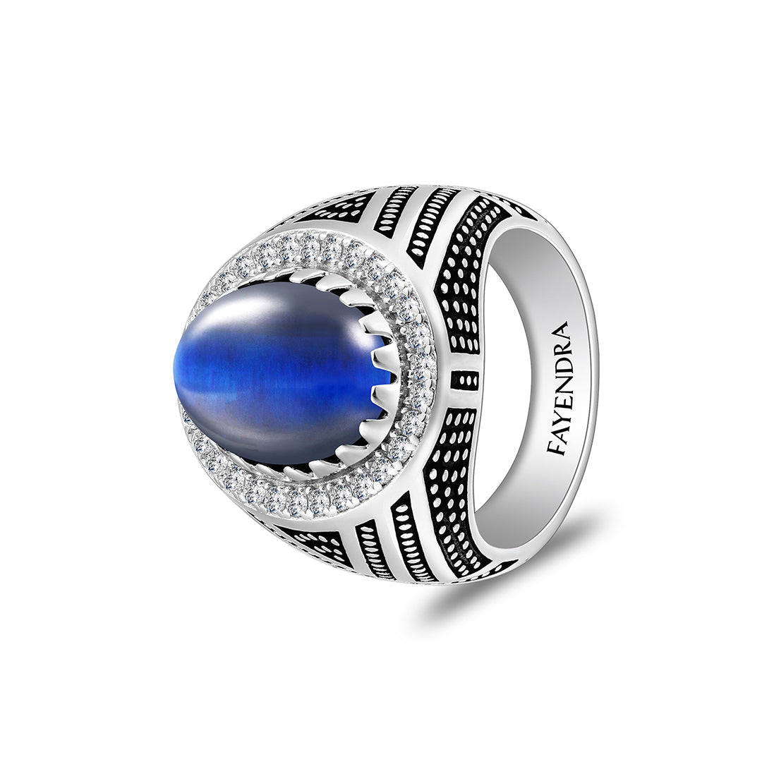 خاتم رجالي من الفضة الخالصة عيار 925 مطلي روديوم و اسود مرصع احجار عين النمر ازرق كابشون و فص ابيض