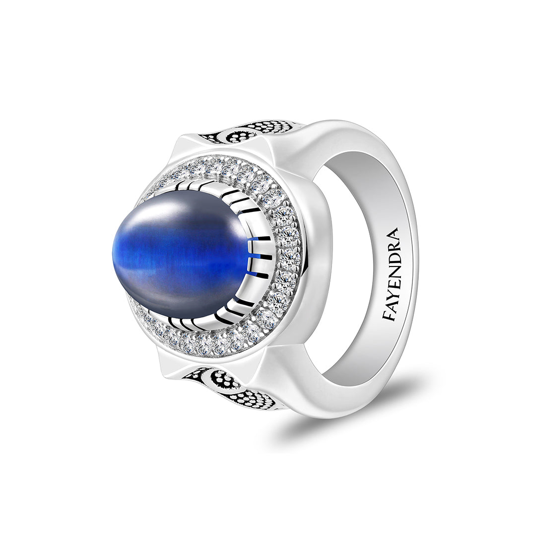 خاتم رجالي من الفضة الخالصة عيار 925 مطلي روديوم و اسود مرصع احجار عين النمر ازرق كابشون و فص ابيض