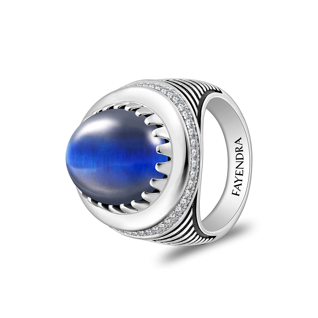 خاتم رجالي من الفضة الخالصة عيار 925 مطلي روديوم و اسود مرصع احجار عين النمر ازرق كابشون و فص ابيض