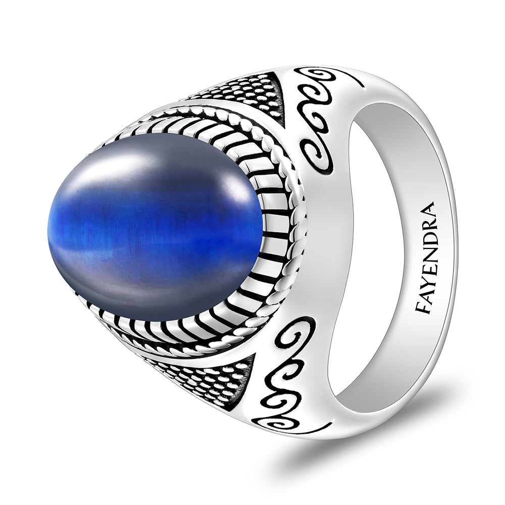 خاتم رجالي من الفضة الخالصة عيار 925 مطلي روديوم و اسود مرصع عين النمر ازرق كابشون