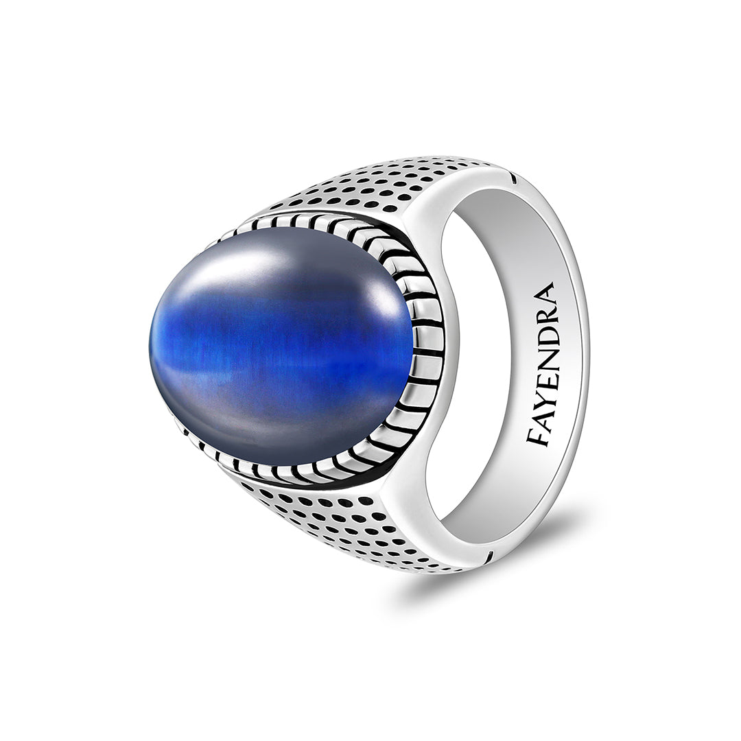 خاتم رجالي من الفضة الخالصة عيار 925 مطلي روديوم و اسود مرصع احجار عين النمر ازرق كابشون