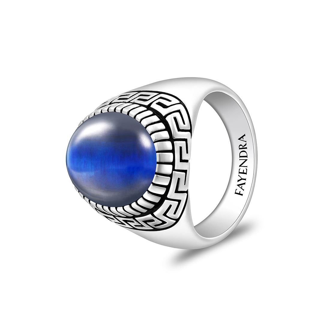 خاتم رجالي من الفضة الخالصة عيار 925 مطلي روديوم و اسود مرصع احجار عين النمر ازرق كابشون