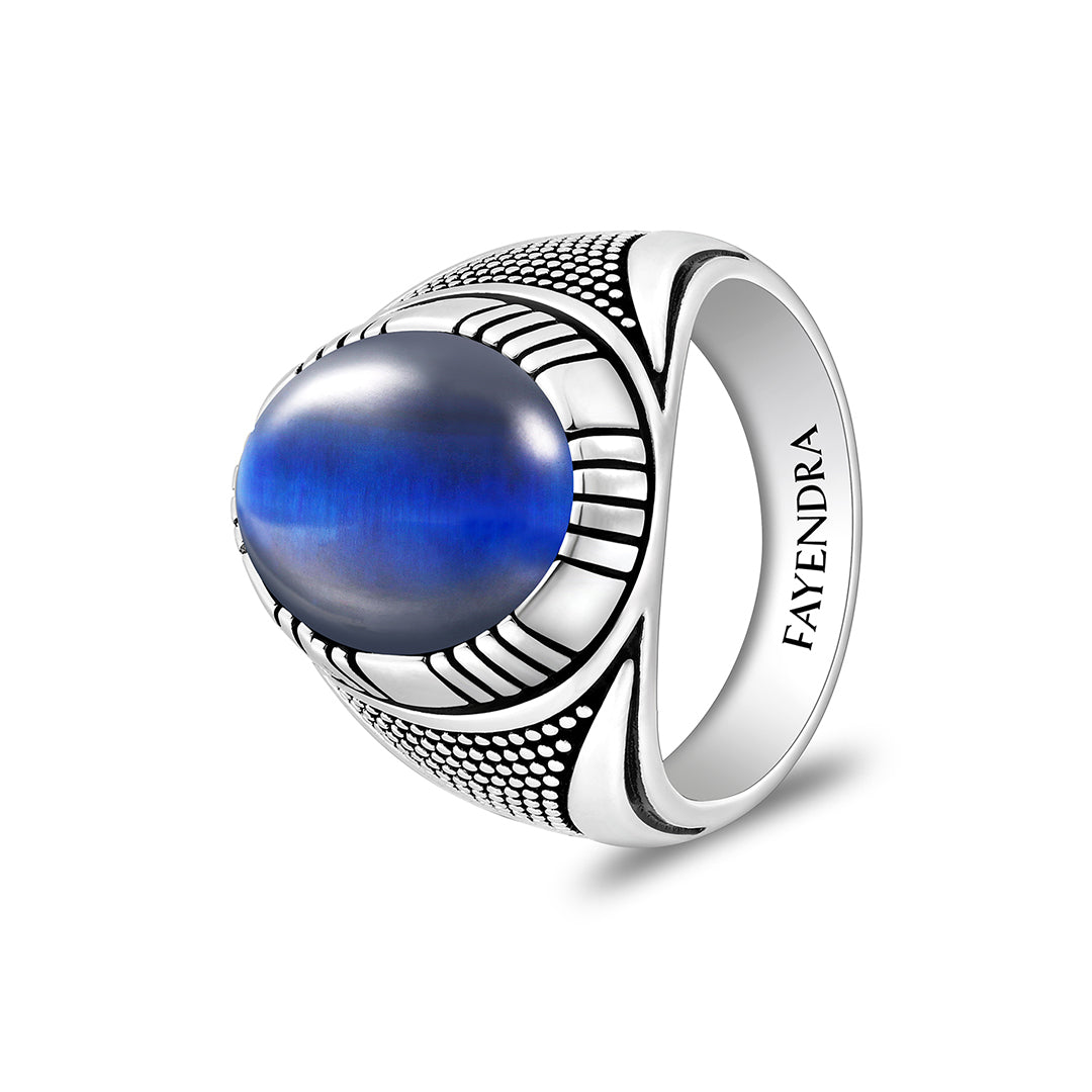 خاتم رجالي من الفضة الخالصة عيار 925 مطلي روديوم و اسود مرصع احجار عين النمر ازرق كابشون