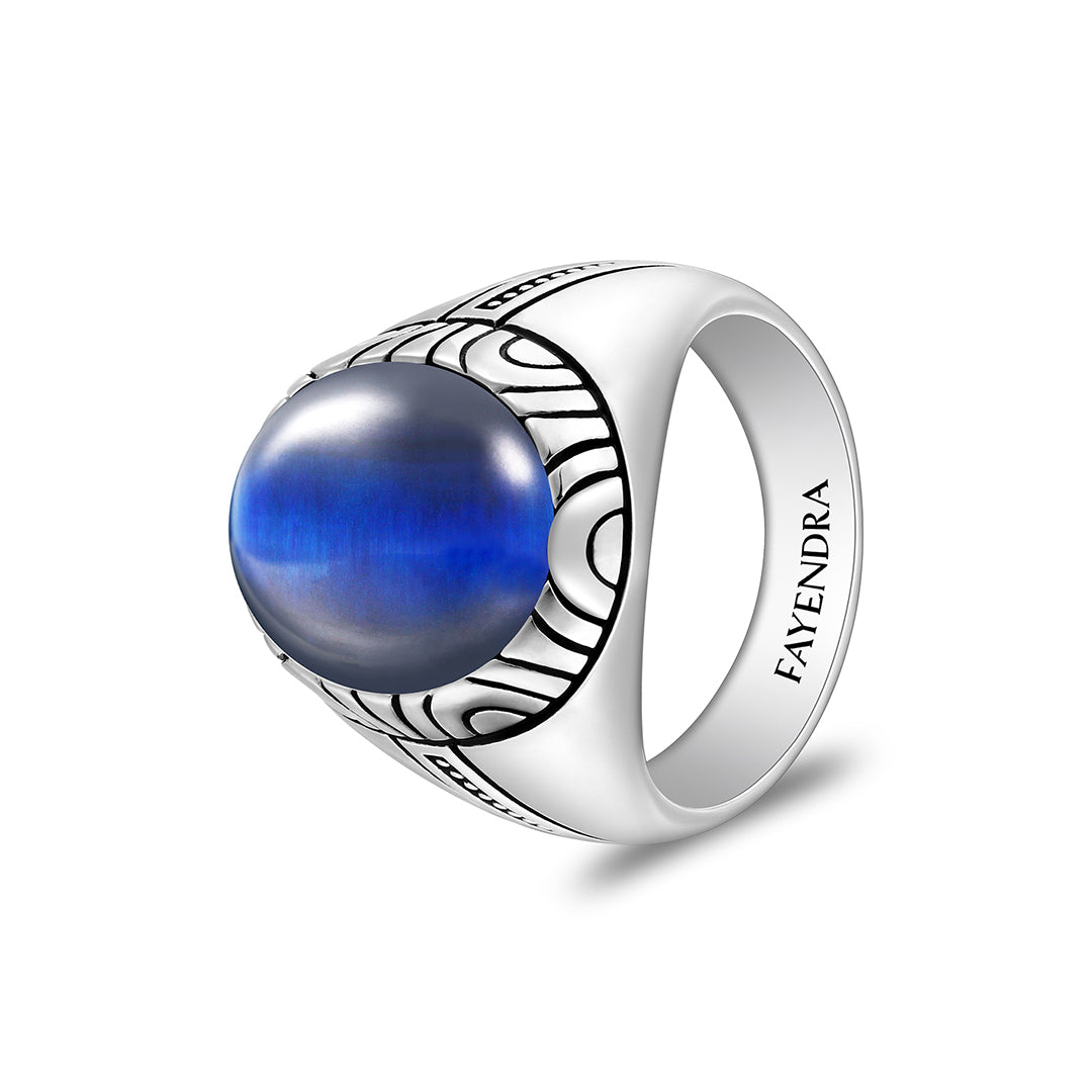 خاتم رجالي من الفضة الخالصة عيار 925 مطلي روديوم و اسود مرصع احجار عين النمر ازرق كابشون