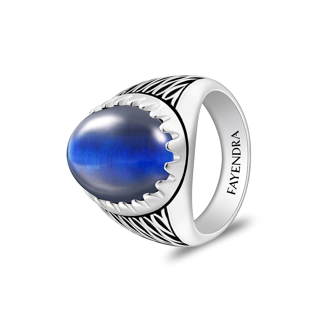 خاتم رجالي من الفضة الخالصة عيار 925 مطلي روديوم و اسود مرصع احجار عين النمر ازرق كابشون