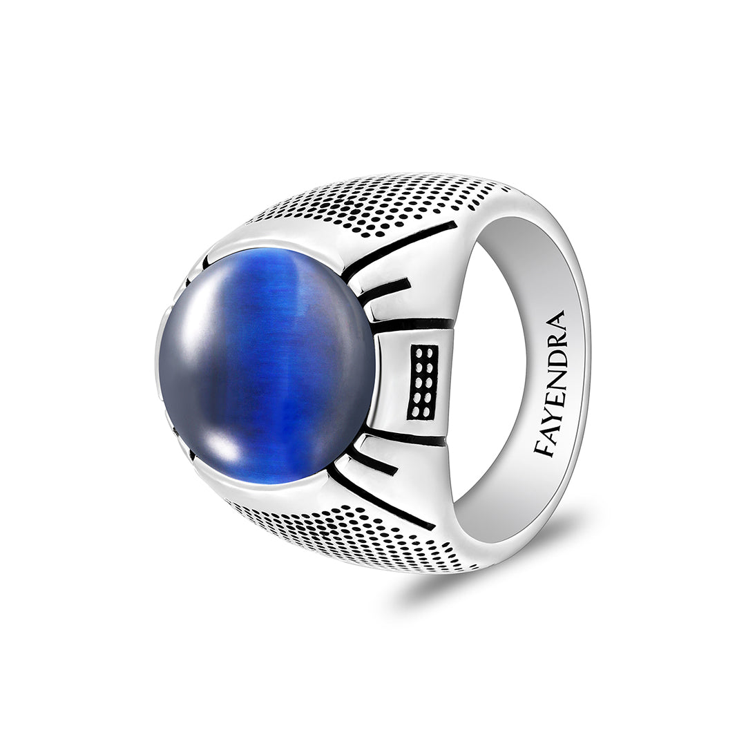 خاتم رجالي من الفضة الخالصة عيار 925 مطلي روديوم و اسود مرصع احجار عين النمر ازرق كابشون
