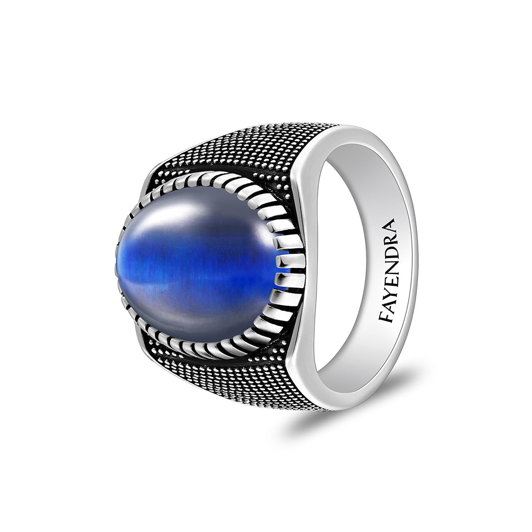 خاتم رجالي من الفضة الخالصة عيار 925 مطلي روديوم و اسود مرصع احجار عين النمر ازرق كابشون