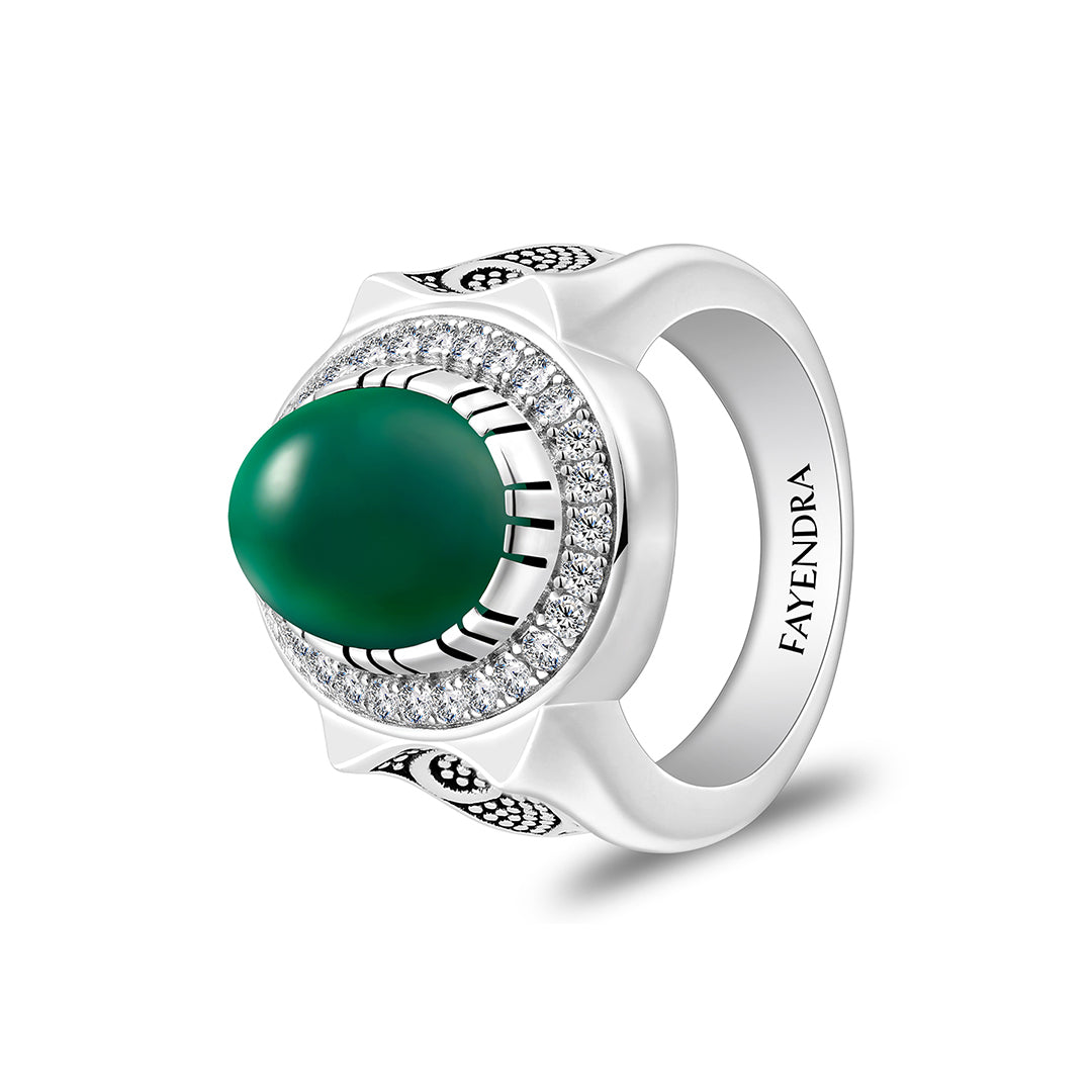 خاتم رجالي من الفضة الخالصة عيار 925 مطلي روديوم و اسود مرصع احجار عقيق جاد اخضر كابشون و فص ابيض