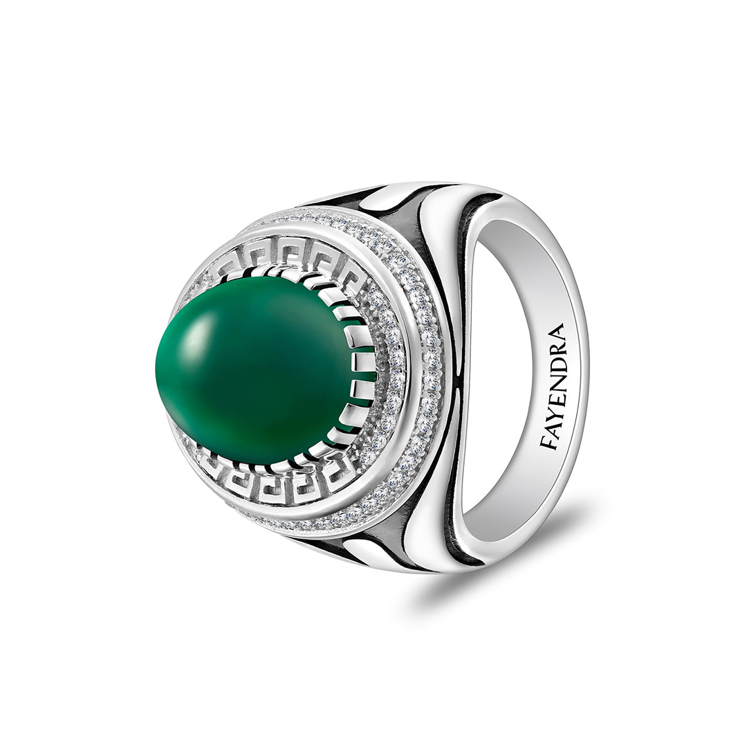 خاتم رجالي من الفضة الخالصة عيار 925 مطلي روديوم و اسود مرصع احجار عقيق جاد اخضر كابشون و فص ابيض