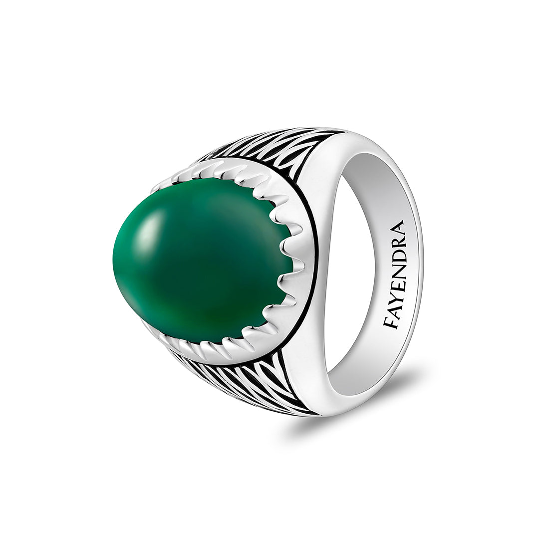 خاتم رجالي من الفضة الخالصة عيار 925 مطلي روديوم و اسود مرصع احجار عقيق جاد اخضر كابشون