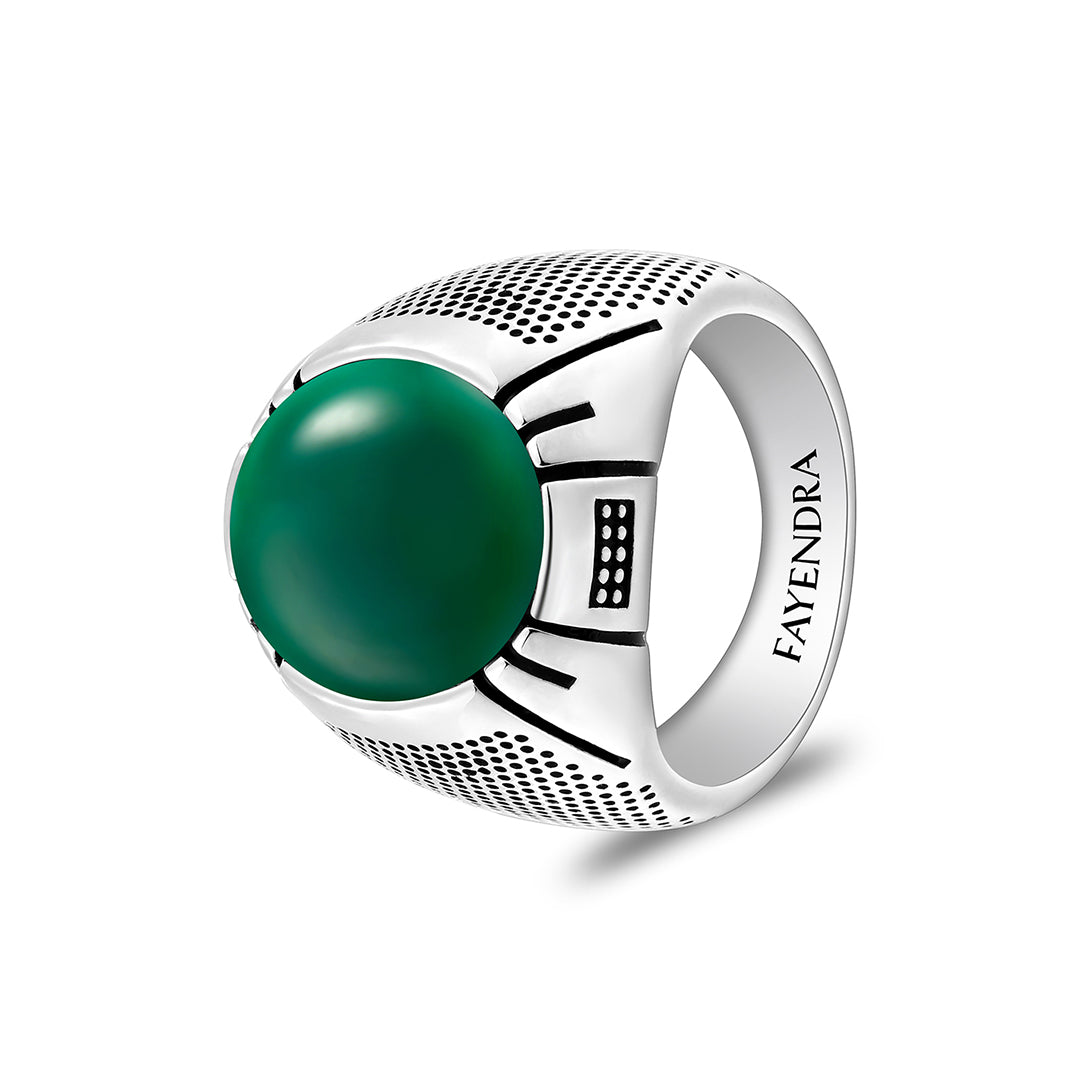 خاتم رجالي من الفضة الخالصة عيار 925 مطلي روديوم و اسود مرصع احجار عقيق جاد اخضر كابشون