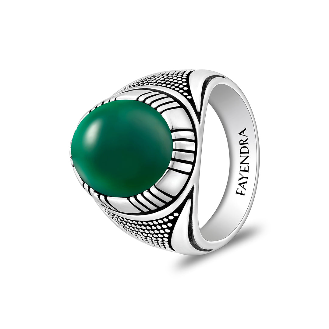 خاتم رجالي من الفضة الخالصة عيار 925 مطلي روديوم و اسود مرصع احجار عقيق جاد اخضر كابشون