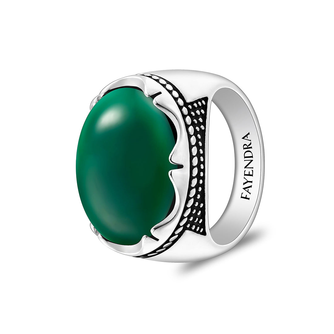 خاتم رجالي من الفضة الخالصة عيار 925 مطلي روديوم و اسود مرصع احجار عقيق جاد اخضر كابشون
