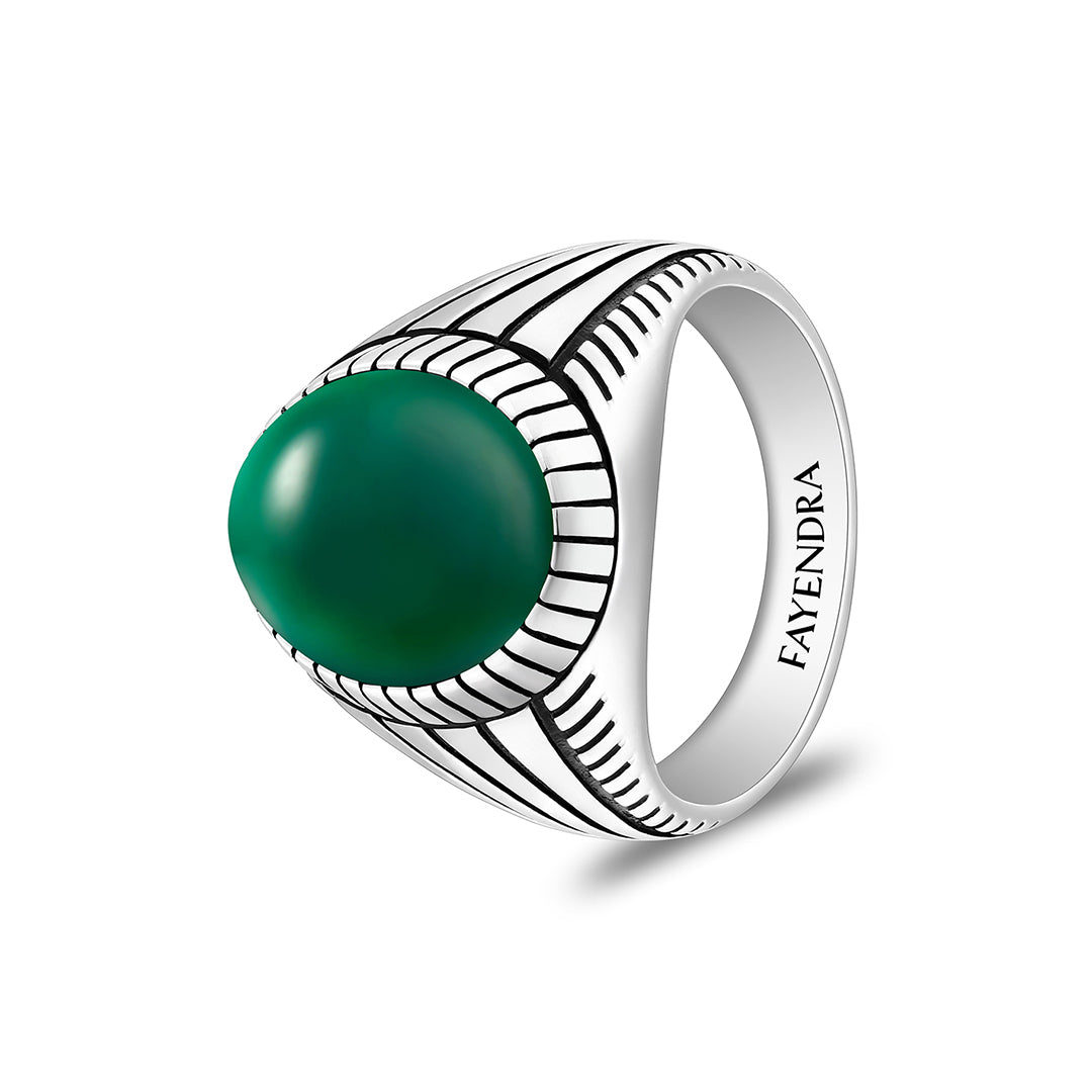 خاتم رجالي من الفضة الخالصة عيار 925 مطلي روديوم و اسود مرصع احجار عقيق جاد اخضر كابشون