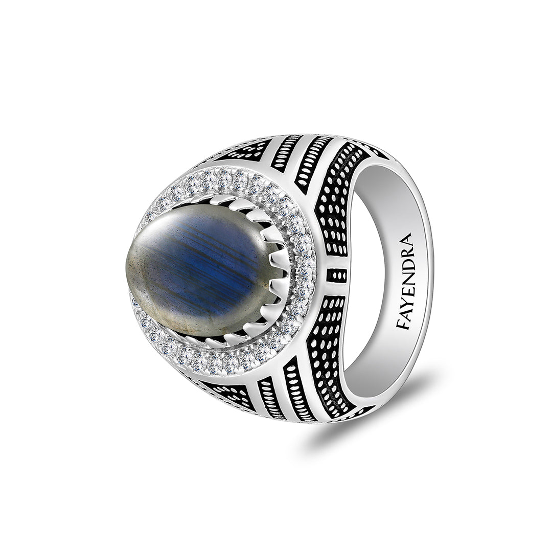 خاتم رجالي من الفضة الخالصة عيار 925 مطلي روديوم و اسود مرصع احجار لابرادوريت اوبالي كابشون وفص ابيض