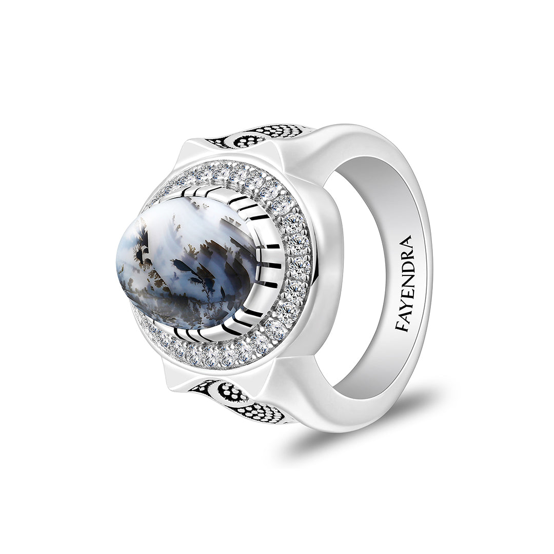 خاتم رجالي من الفضة الخالصة عيار 925 مطلي روديوم و اسود مرصع احجار عقيق مشجر طبيعي كابشون و فص ابيض