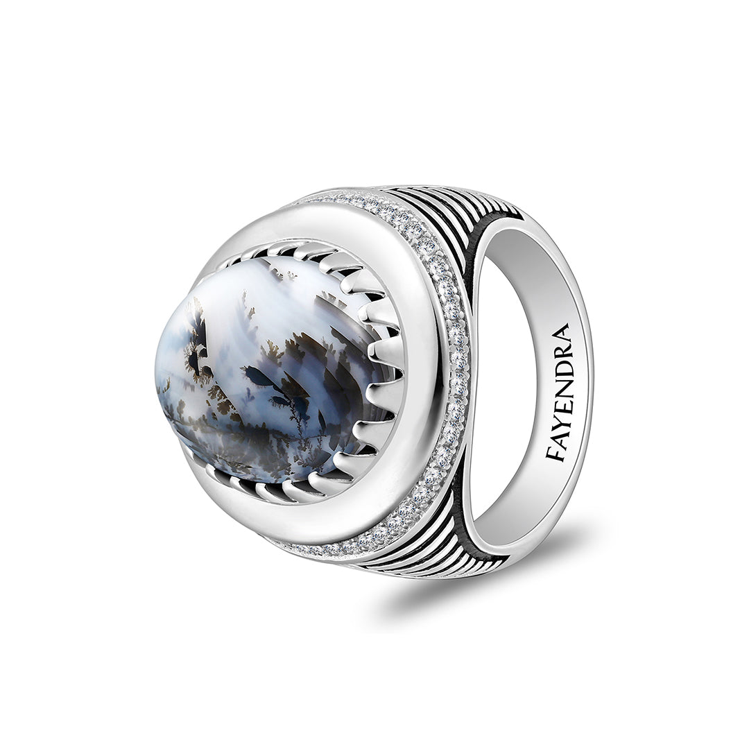 خاتم رجالي من الفضة الخالصة عيار 925 مطلي روديوم و اسود مرصع احجار عقيق مشجر طبيعي كابشون و فص ابيض