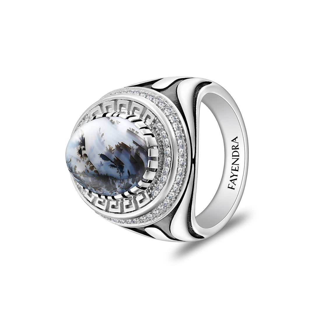 خاتم رجالي من الفضة الخالصة عيار 925 مطلي روديوم و اسود مرصع احجار عقيق مشجر طبيعي كابشون و فص ابيض