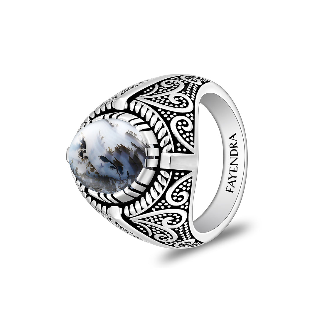 خاتم رجالي من الفضة الخالصة عيار 925 مطلي روديوم و اسود مرصع احجار عقيق مشجر طبيعي كابشون