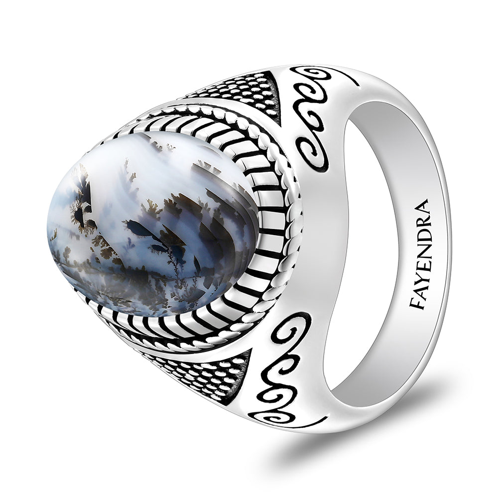خاتم رجالي من الفضة الخالصة عيار 925 مطلي روديوم و اسود مرصع عقيق مشجر طبيعي كابشون